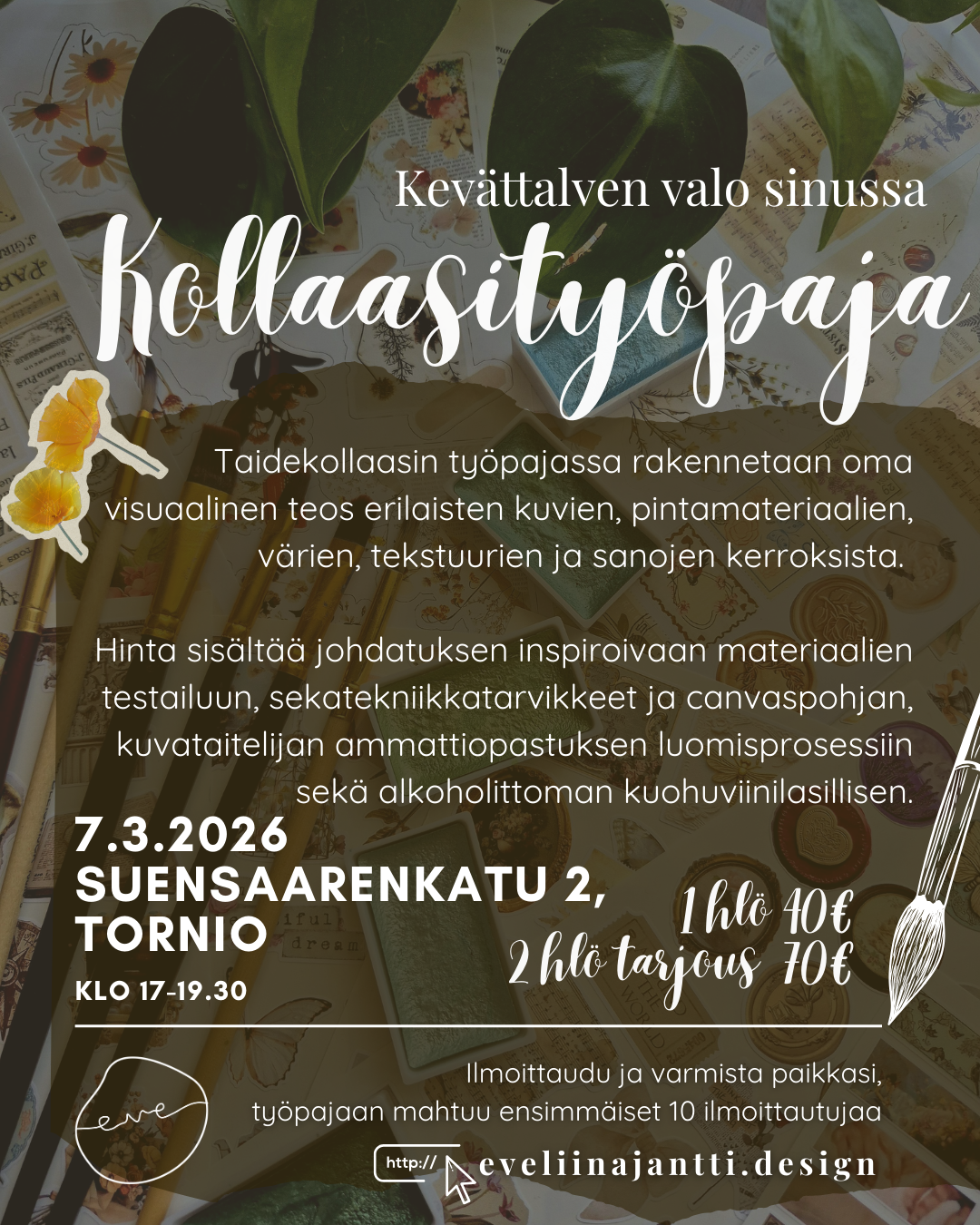 Hinta työpajaan on 40€ / henkilö. Tarjouksena kahden henkilön ilmoittautuminen yhteensä 70€ / 2 hlö.